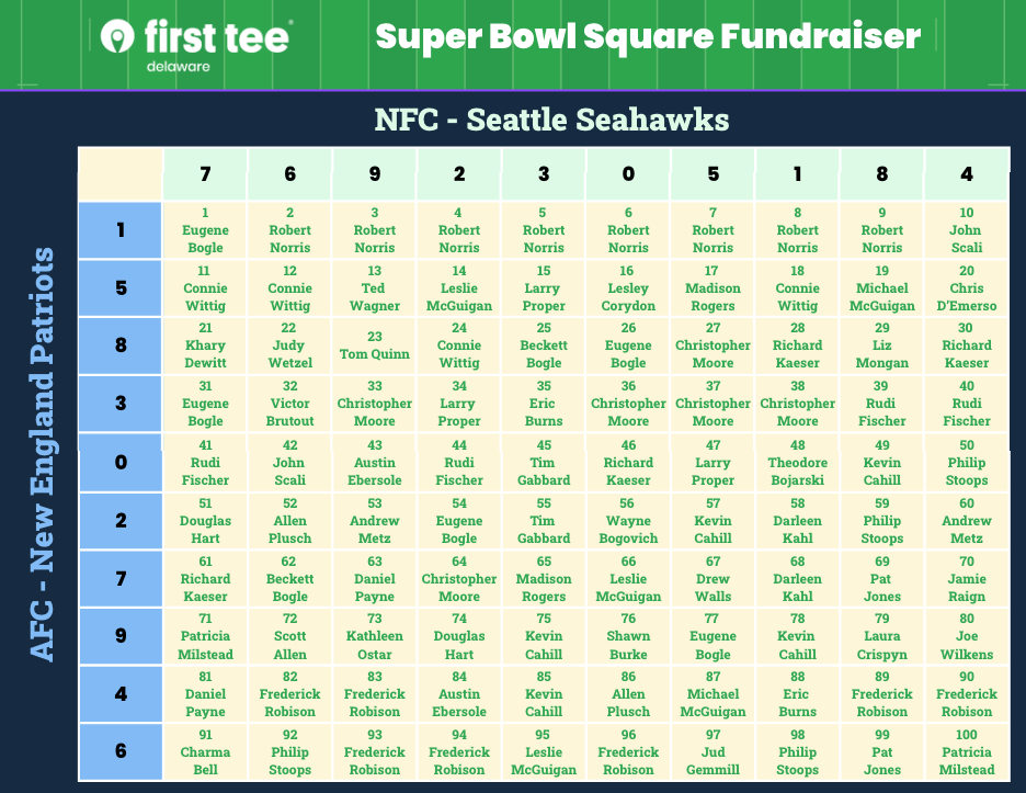 If your square matches the last digit of each team’s score you win. For example: Score of 21-14, the box at the intersection of 1 & 4 wins.